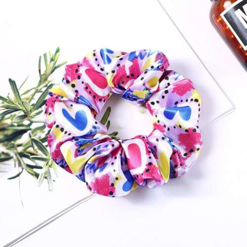Scrunchie με σατέν υφή – Χρώμα λιλά με πολύχρωμες καρδιές