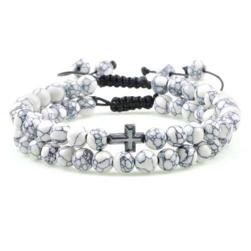 Ανδρικό βραχιόλι – Διπλό με λευκές μαρμάρινες χάνδρες και σταυρό