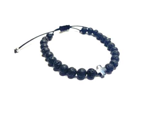 Ανδρικό βραχιόλι – Μαύρες χάντρες λάβας με σταυρό αιματίτη