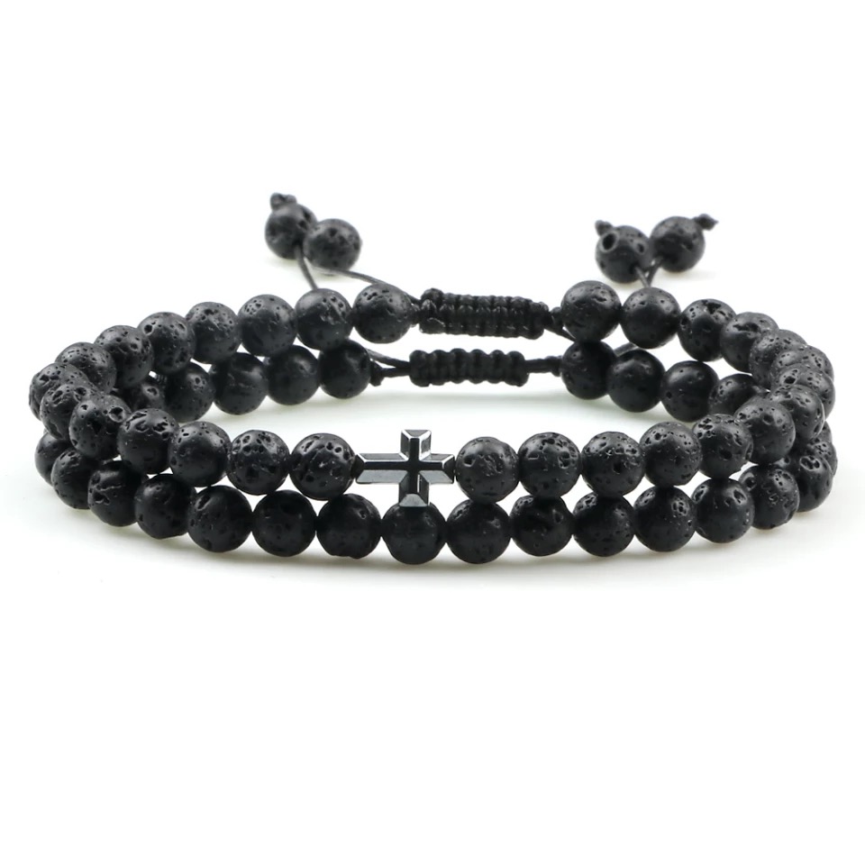 Διπλό ανδρικό βραχιόλι με ηφαιστειακές χάνδρες και σταυρό.